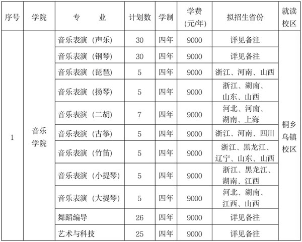 【注】:1.音樂表演(聲樂)專業擬面向浙江、安徽、福建、河北、黑龍江、湖北、湖南、江蘇、江西、遼寧、山東、山西、四川等13個省份招生,專業成績承認相應省統考成績。